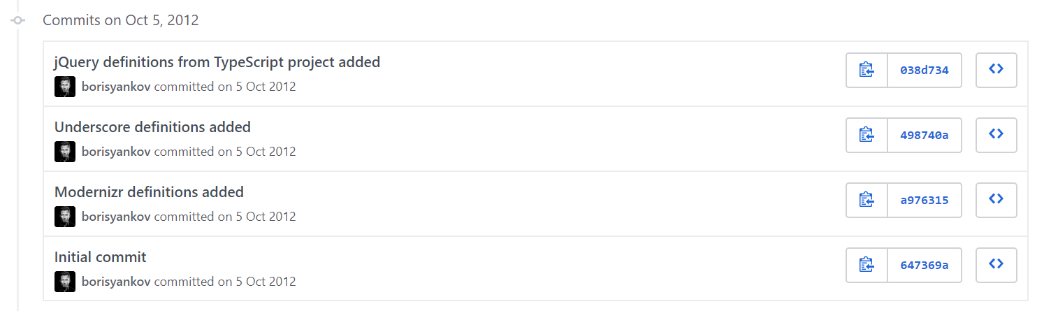 Boris quickly learned how to write a type definition and set to work. Most libraries weren't well documented and so he found himself reading the source code of libraries he used in order that he could write the definitions. At first, the definitions were just files dropped in his ASP.NET MVC projects that he copied around. That wasn't going to scale; there needed to be somewhere he could go to grab type definitions when he needed them. And so on October 5th 2012 he created a repository under his profile at GitHub called "DefinitelyTyped": https://github.com/DefinitelyTyped/DefinitelyTyped/commit/647369a322be470d84f8d226e297267a7d1a0796