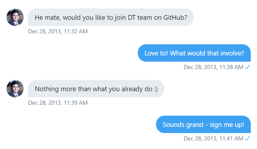 On December 28th 2013 Basarat decided that a regular contributor to Definitely Typed might be a potential team member. Bas opened up Twitter and sent a Direct Message to John Reilly.